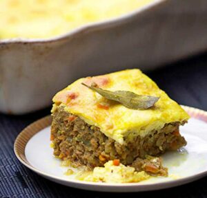 De la viande hachée mélangée avec du lait, des amandes, de la confiture d’abricot et du curry, cuite au four. Il paraît que c’est très bon ! Miam miam !
